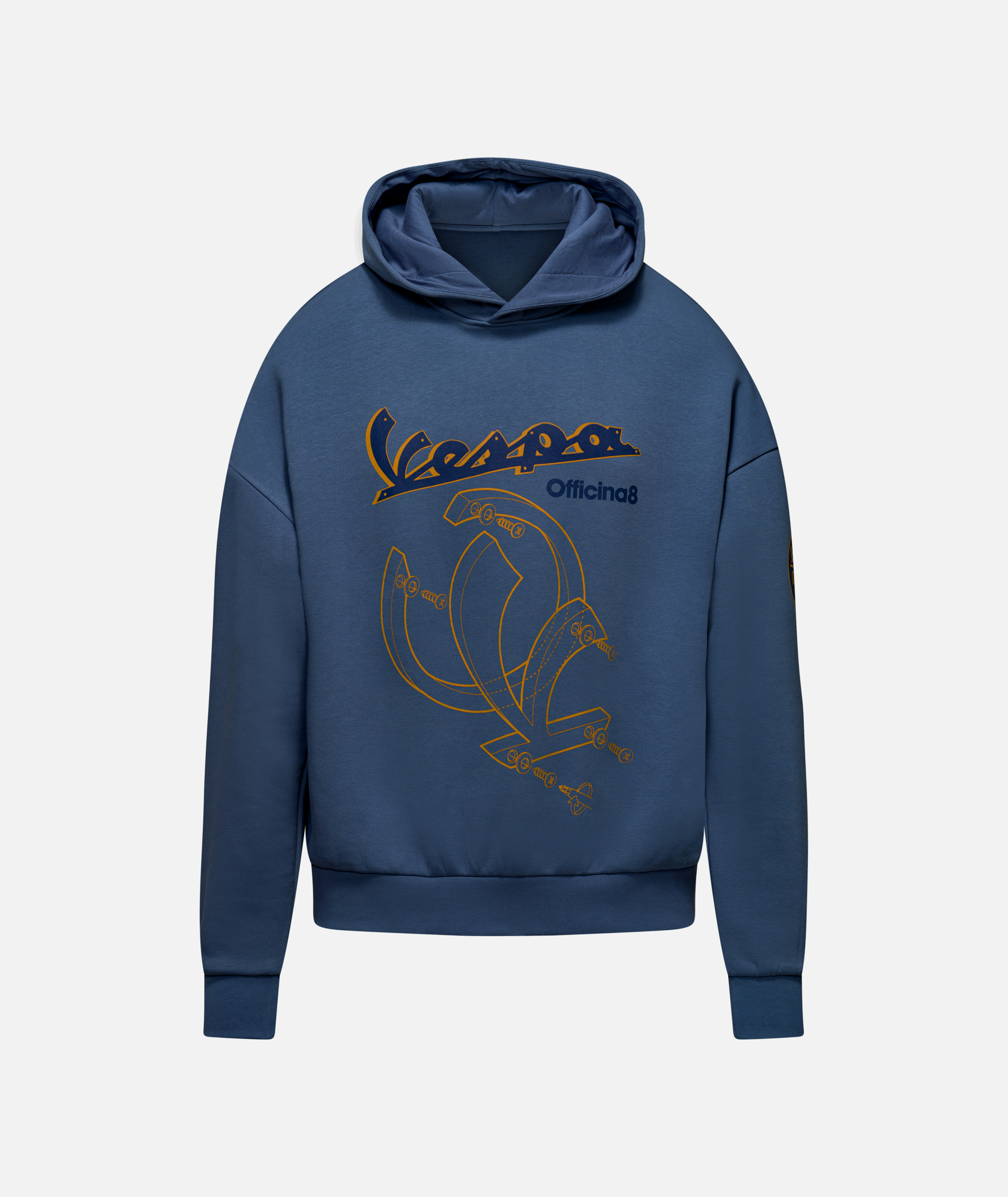Een comfortabele en warme hoodie van zachte, geborstelde katoenen stof. Voorzien van het Vespa Officina 8 logo en nieuwe graphics op de voorkant en mouw, en een exclusief bedrukt label aan de binnenkant.