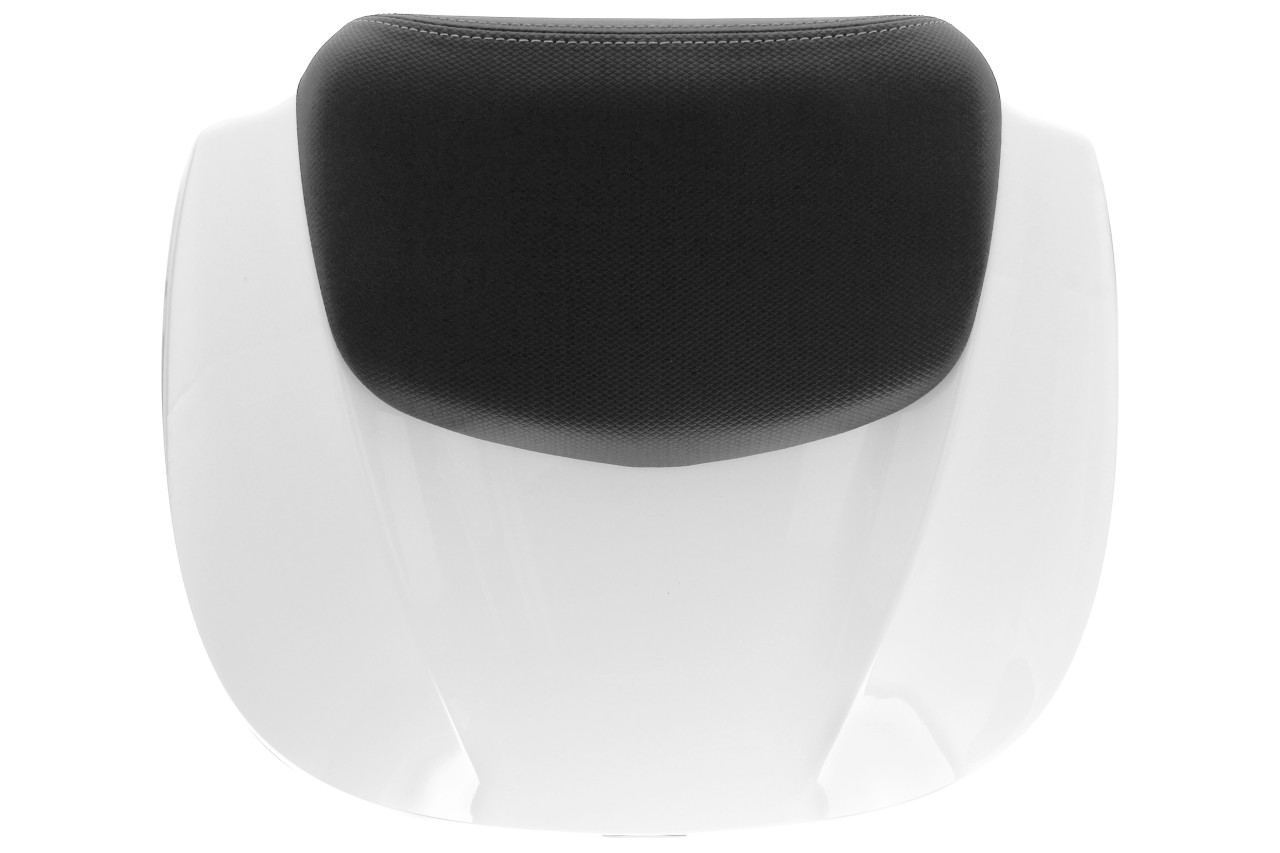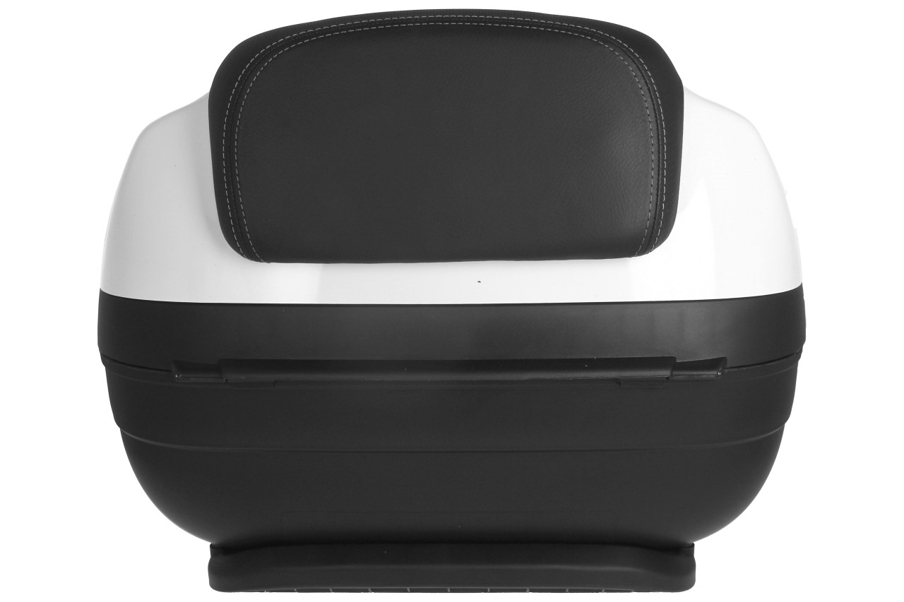 Topkoffer met snelmontagesysteem. Biedt ruimte voor een modulaire helm. Bovenste koffer gelakt in de kleur van het voertuig, met comfort rugkussen voor de passagier, in hetzelfde materiaal en dezelfde afwerking als de zitting.